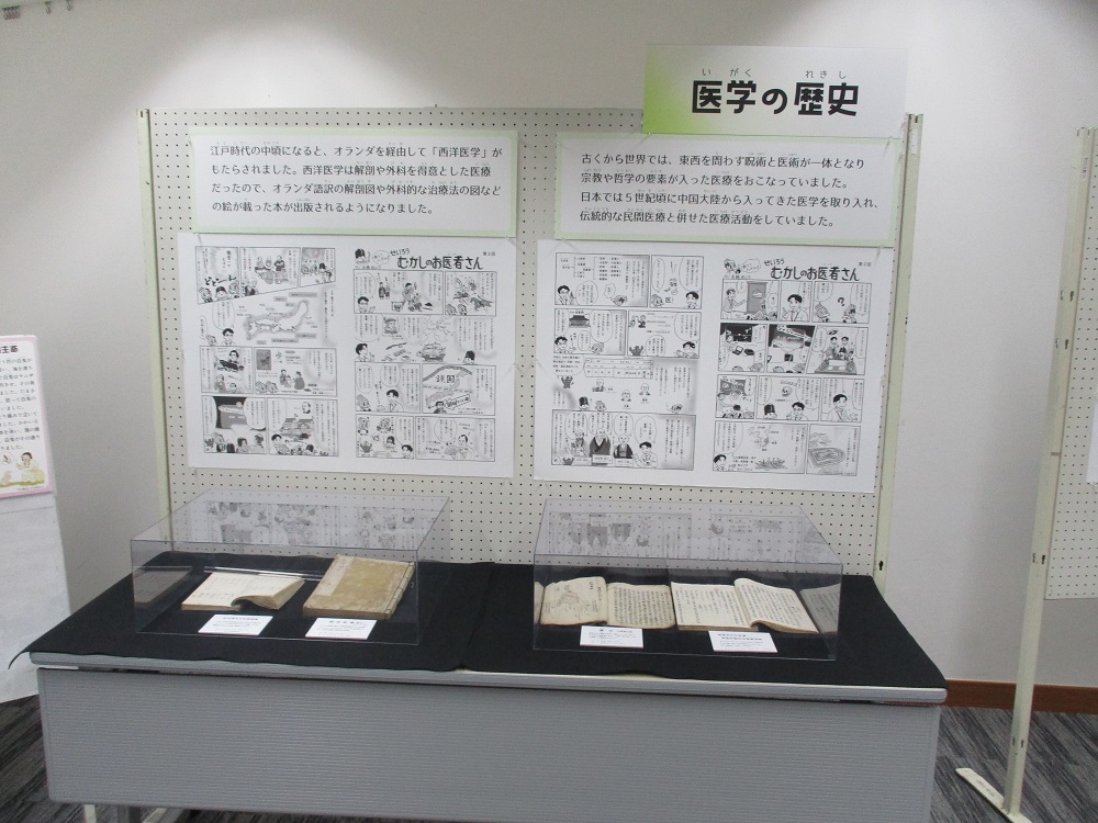 有名な「解体新書」の第1巻や、お灸のツボを図示した「灸点図解」など珍しい本を展示しています。